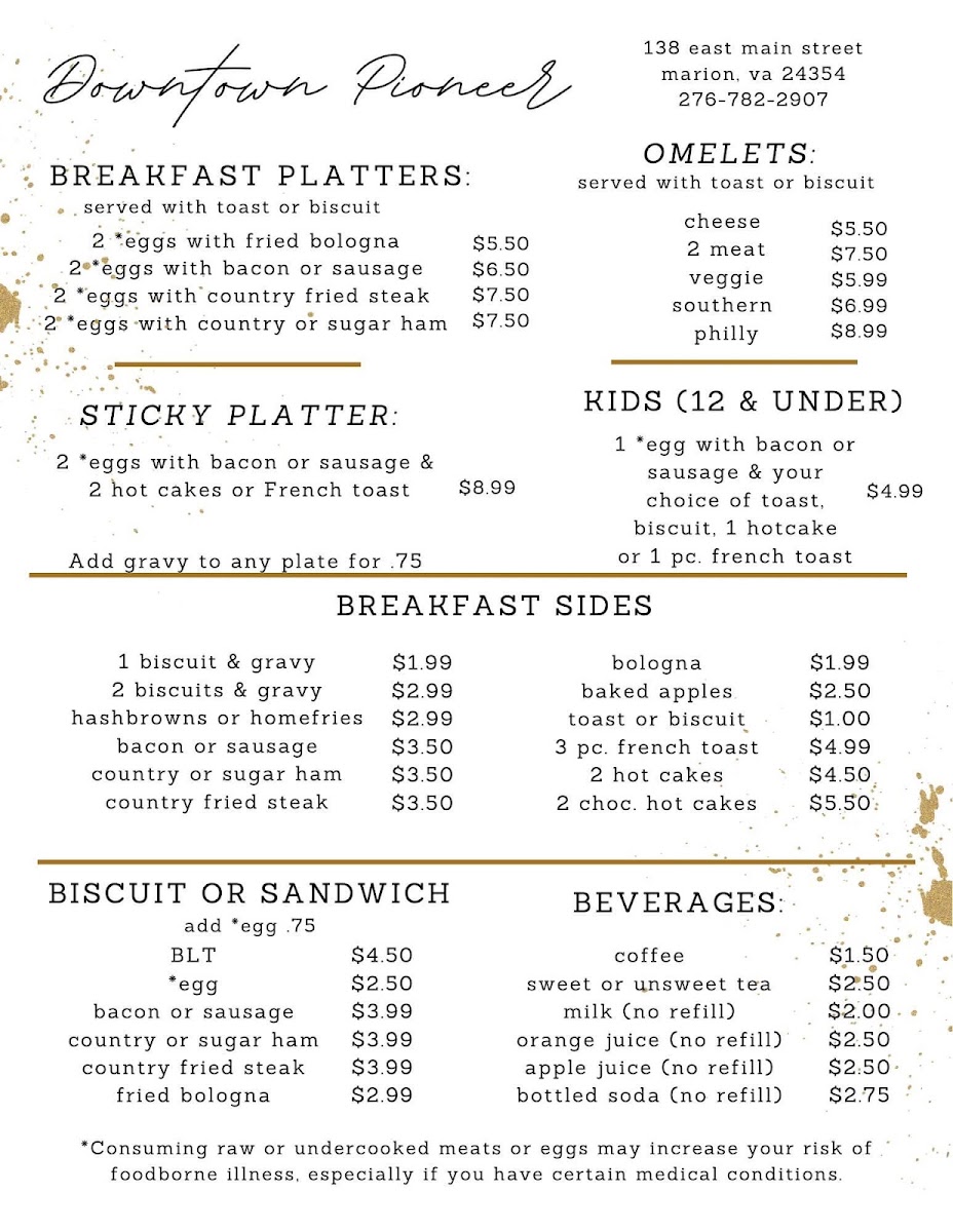 At Downtown Pioneer Menu, you're in for a delightful culinary experience right in the heart of Marion, VA. Whether you're here for a casual meal or a special occasion, this menu offers a variety of dishes to satisfy all tastes. From savory comfort foods to fresh, seasonal options, there's something for everyone to enjoy. Indulge in mouthwatering appetizers, hearty entrees, and flavorful sides, all prepared with care using high-quality ingredients. With each dish carefully crafted, it’s clear that Downtown Pioneer Menu is all about great food and good company.